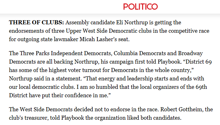 Assembly candidate Eli Northrup is getting the endorsements of three Upper West Side Democratic clubs in the competitive race for outgoing state lawmaker Micah Lasher’s seat.